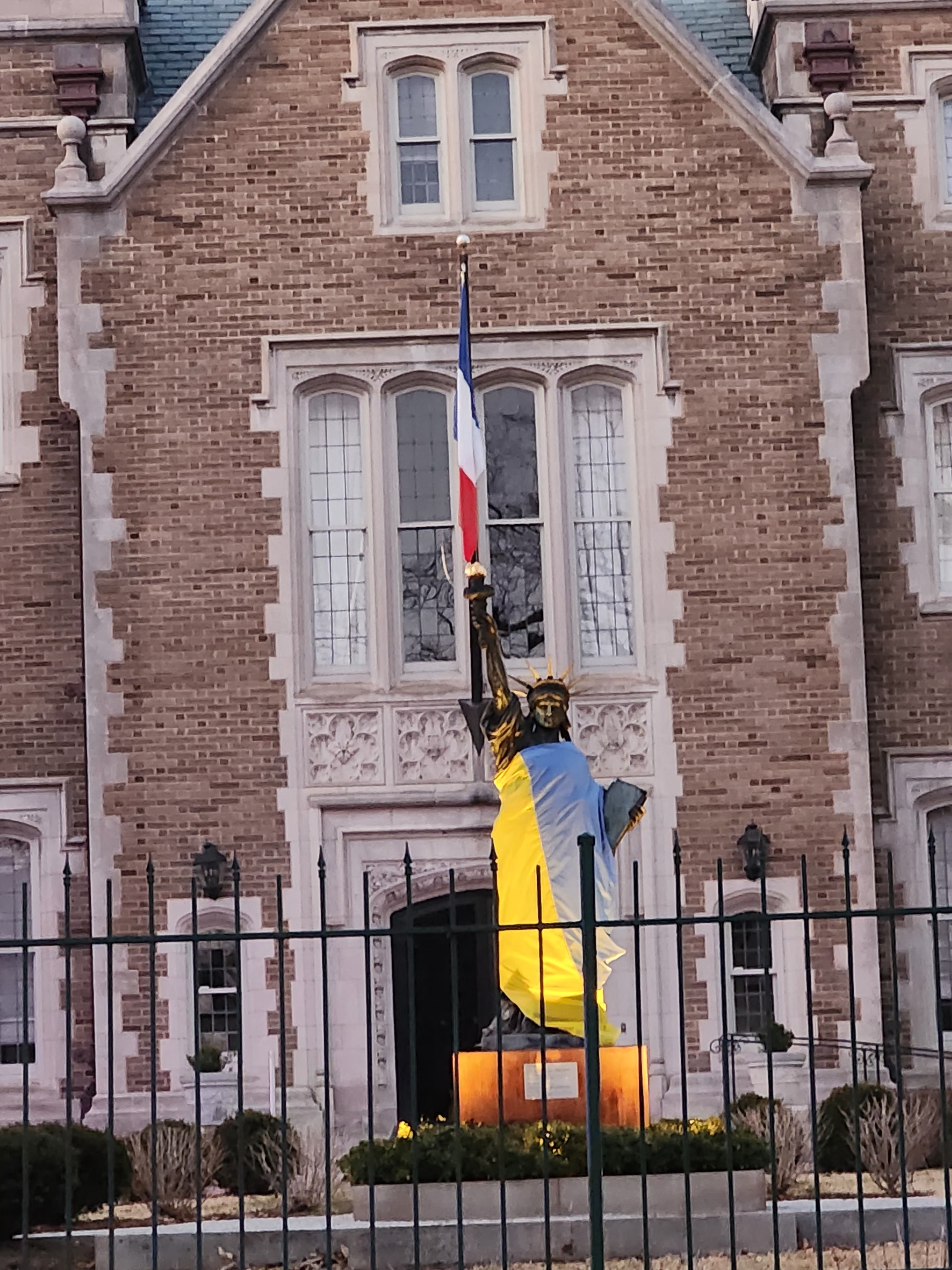 Based in Washington, DC in Dupont Circle and a mile from the White House, am compelled to share – Photos nearby of the Ukranian Cultural Center where brave, dignified Pres. Zelenskyy , Madame Ambassador, and others came late Friday afternoon (Feb. 28, 2025). Across the street from the French Ambassador’s Residence with Statue of Liberty on the front lawn draped in the Ukranian Flag. A time of resolve and clarity for who we are in the midst of the appalling display in the W.H. Friday. Sunflower the National Flower of Ukraine.